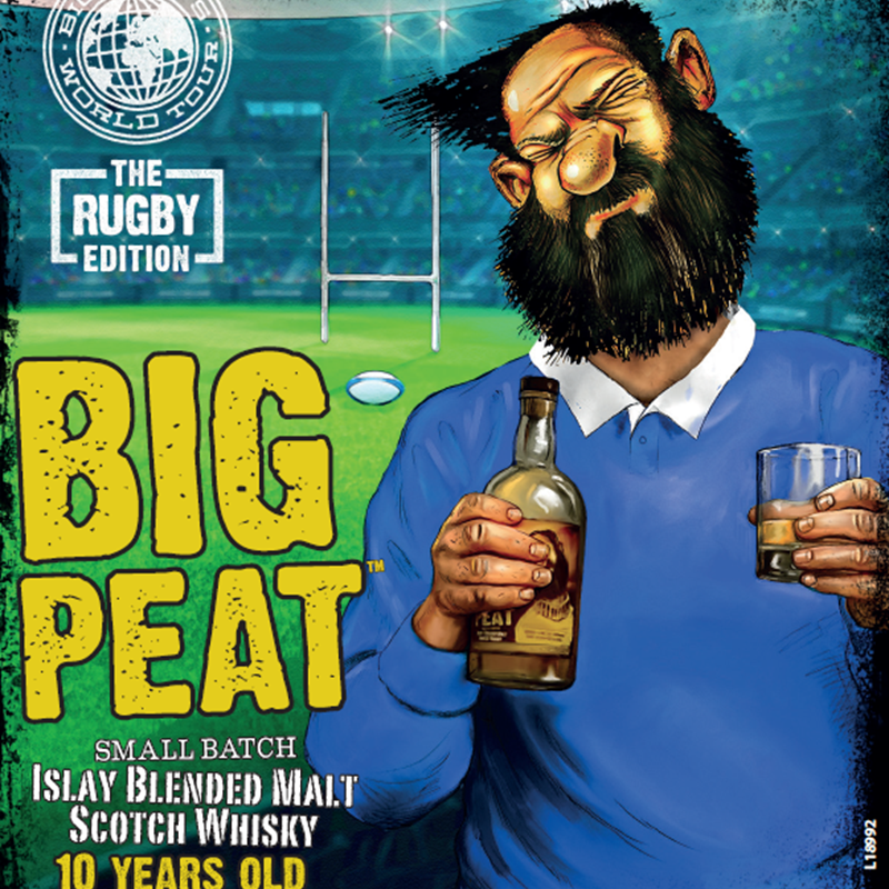 Big Peat has ventured to Italy to see his friends at Rinaldi and enjoy the atmosphere of watching the 2023 Rugby World cup on screen together. Dressed in the Italian blue jersey, he is enjoying a dram of his classic Islay malt.